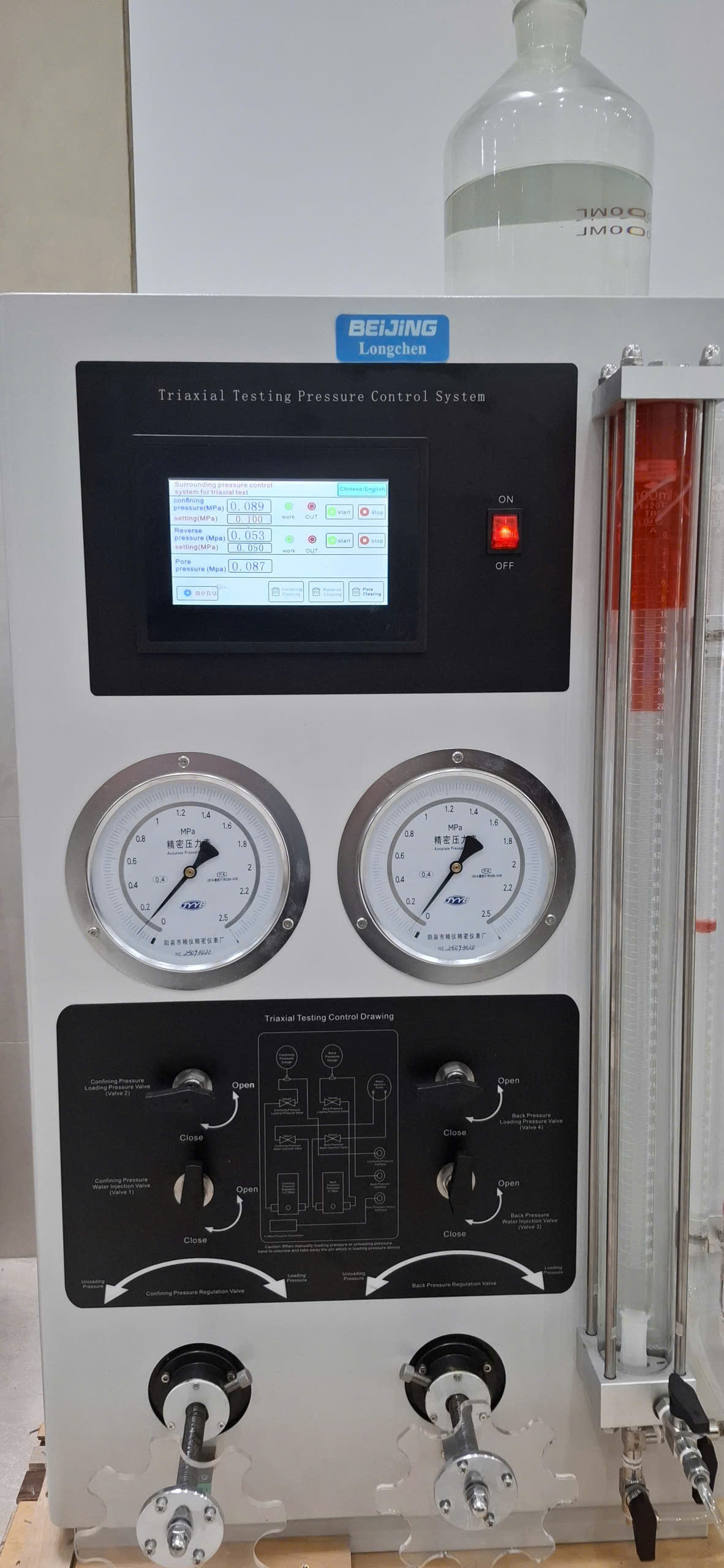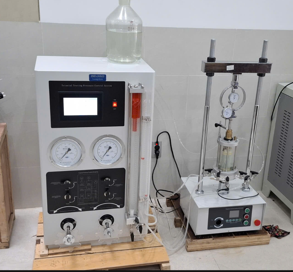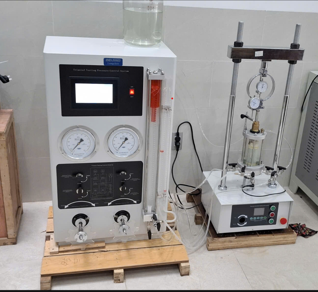 Máy được thiết kế với hệ thống điều chỉnh áp lực buồng nén, áp lực nước lỗ rỗng và áp lực ngược, đảm bảo kết quả thí nghiệm ổn định.